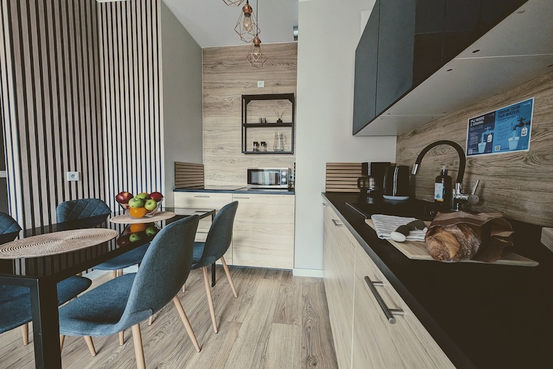 Kuchnia: kuchenka z piekarnikiem, zmywarka, lodówka, czajnik, naczynia kuchenne