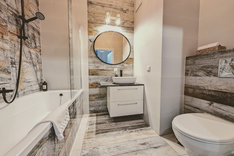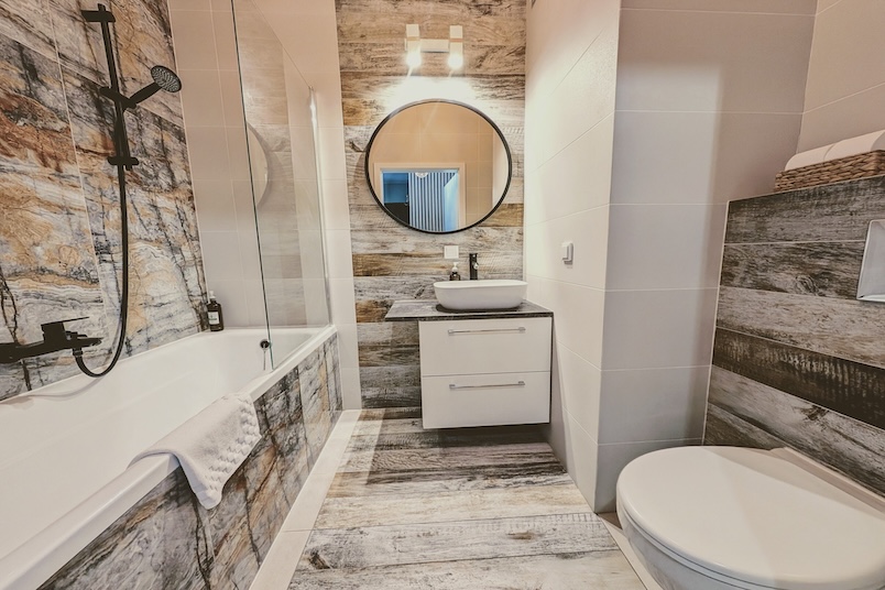 Łazienka: prysznic, pralka, suszarka do włosów, ręczniki