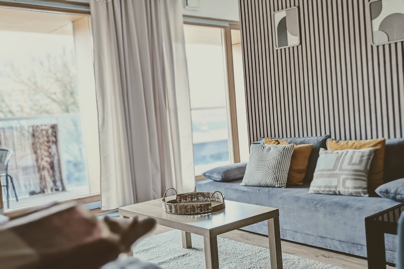 Salon: rozkładana kanapa, stolik kawowy, stół, krzesła, telewizor LCD z kablówką. Internet w cenie