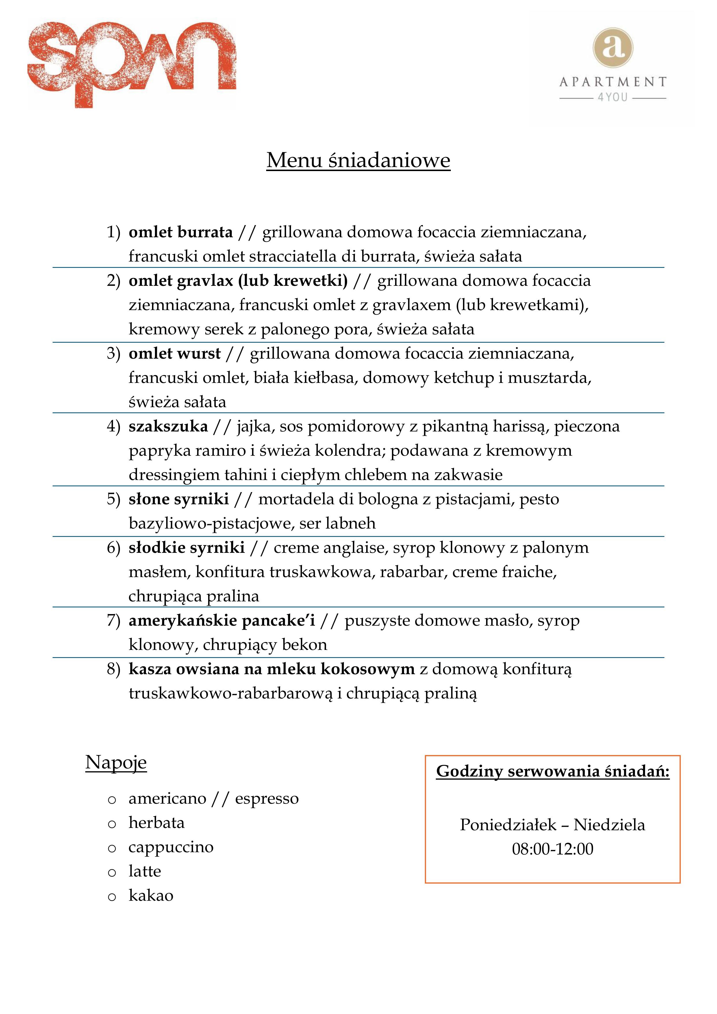 Planując pobyt w naszych apartamentach w centrum Warszawy, możesz skorzystać również z oferty śniadań w restauracji Spun, zlokalizowanej przy ul. Kolejowej.